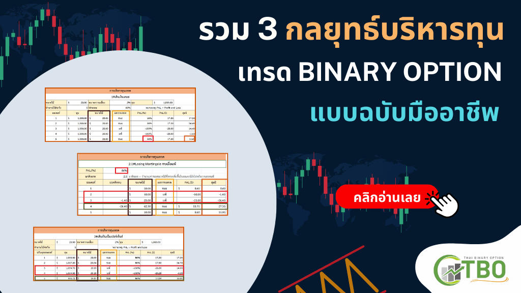Thaibinaryoption.com ย่อให้ กลยุทธ์บริหารทุนเทรด Binary Option: เดินเงินเสมอ: เป็นกลยุทธ์ที่ขนาดไม้เทรดเท่ากันทุกออเดอร์ เหมาะกับเทรดเดอร์ทุกกลุ่ม Martingale: มี 2 กลยุทธ์ ได้แก่ Losing Martingale ปรับขนาดไม้ขึ้นเมื่อแพ้ให้ทุนคืนและกำไรในไม้เดียว, Winning Martingale ปรับขนาดไม้ขึ้นเมื่อชนะ เหมาะกับเทรดเดอร์ทุนหนา เดินเงินเป็นเปอร์เซ็นต์: ปรับขนาดไม้ทุกออเดอร์ตามปริมาณเงินทุนที่เพิ่มหรือลดลง เหมาะกับเทรดเดอร์สายปั้นพอร์ต เคล็ดลับในการเทรด: Winrate สำคัญที่สุด ไม่ควรน้อยกว่า 60%, ต้องมีจุด Stop Loss และมือใหม่ควรเริ่มต้นด้วยกลยุทธ์บริหารทุนเทรดแบบเดินเงินเสมอ หรือเดินเงินเป็นเปอร์เซ็นต์ 3 กลยุทธ์บริหารทุนเทรดยอดนิยม 3 กลยุทธ์บริหารทุนเทรดยอดนิยม ประกอบด้วย เดินเงินเสมอที่ขนาดไม้เท่ากันทุกออเดอร์, Martingale ปรับขนาดเมื่อเทรดแพ้หรือชนะ และเดินเงินเป็นเปอร์เซ็นต์ที่จะปรับขนาดออเดอรฺตามเงินทุน 1. เดินเงินเสมอ: เทรดด้วยขนาดไม้เท่าเดิม เงินทุน : กำหนดเงินทุน $1,000 ความเสี่ยง : กำหนดขนาดความเสี่ยง 2% ขนาดไม้ต่อออเดอร์ : […]